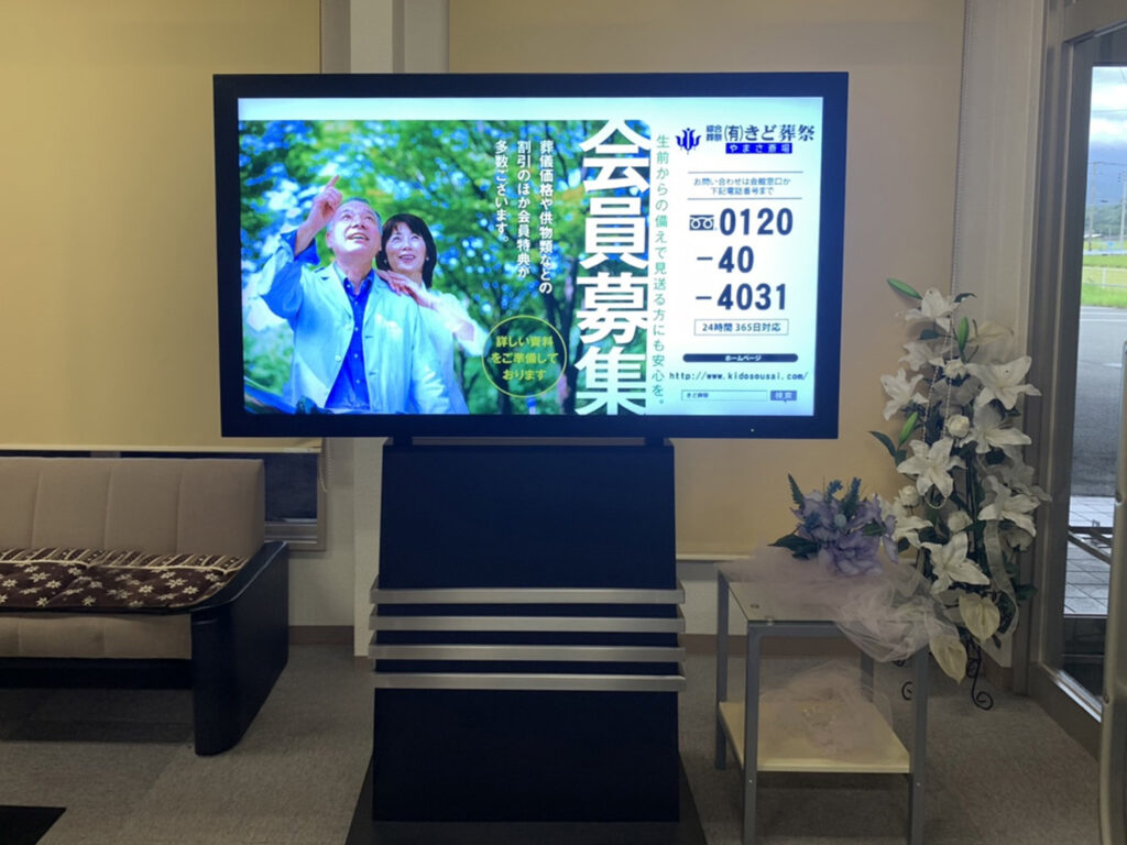 福岡県嘉麻市の有限会社 きど葬祭 やまさ碓井斎場様に屋内用55インチ液晶モニタを設置しました。