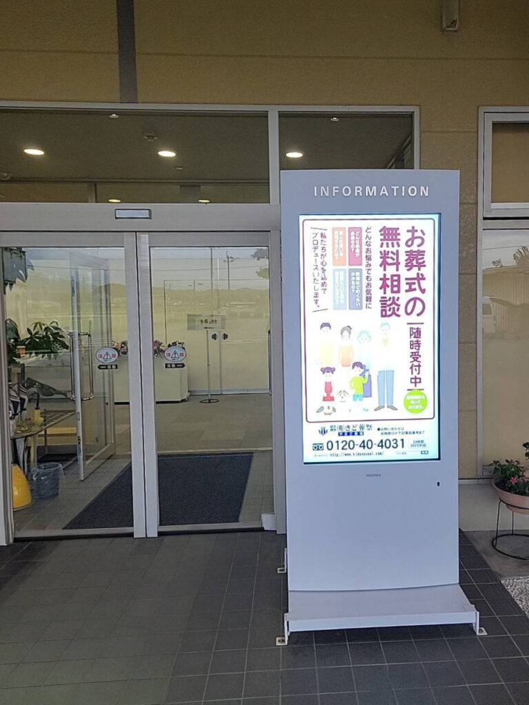 福岡県嘉麻市の有限会社 きど葬祭 やまさ碓井斎場様に屋外用55インチ液晶モニタを設置しました。