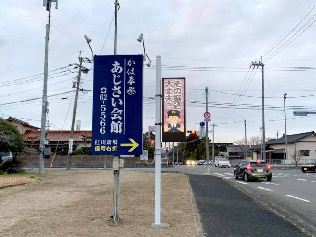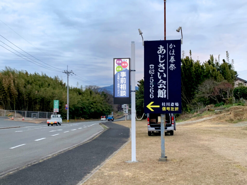 福岡県嘉穂郡の有限会社かほ葬祭 あじさい会館 桂川斎場様にデジタルのぼり君を設置しました。