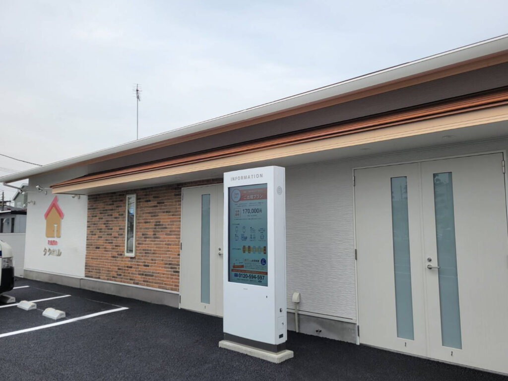 群馬県伊勢崎市のアルファクラブ株式会社 家族葬のタクセル伊勢崎今泉町様に屋外用55インチ液晶モニタを設置しました。