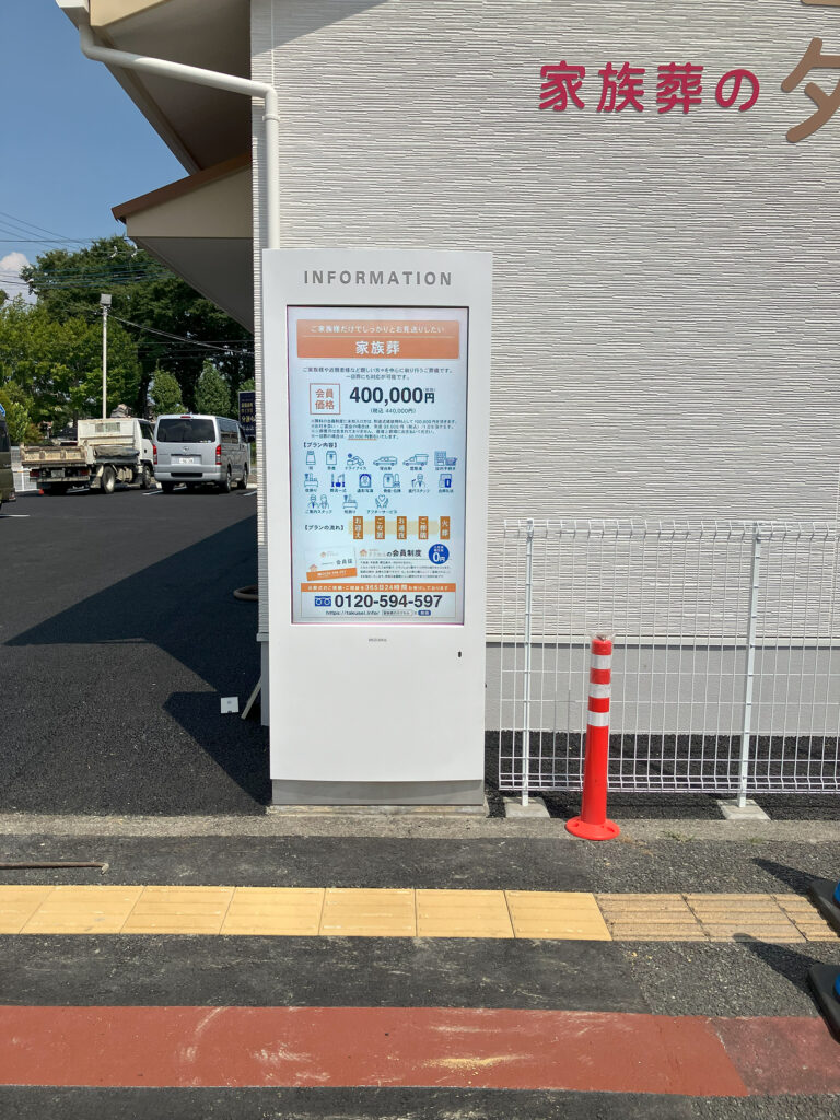群馬県前橋市のアルファクラブ株式会社 家族葬のタクセル前橋南町様に屋外用55インチ液晶モニタを設置しました。