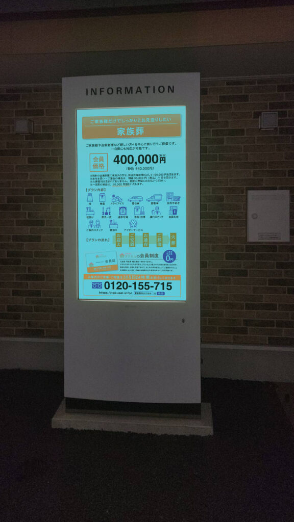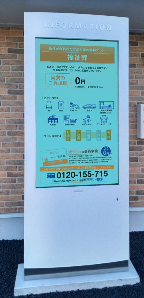 栃木県鹿沼市のアルファクラブ株式会社 家族葬のタクセル石橋町様に屋外用55インチ液晶モニタを設置しました。